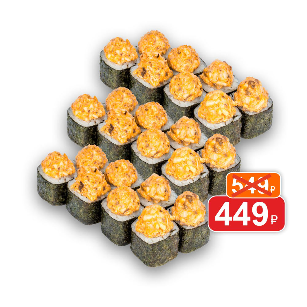 Три запечённых классических ролла с шапкой Спайси Лосось и начинкой из снежного краба (имитация), копчёной курочки и масляной рыбы