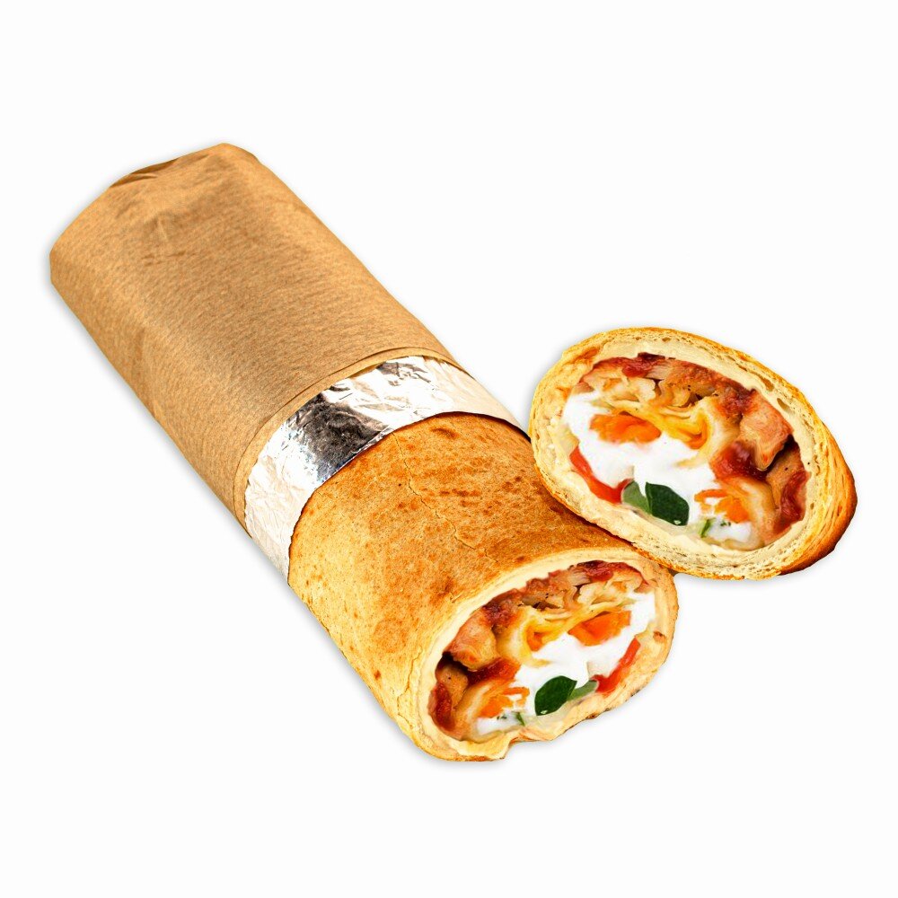 Сыр Моцарелла, колбаски пепперони, ветчина, грудинка, перец халапеньо, соус Спайси, лепешка тортилья