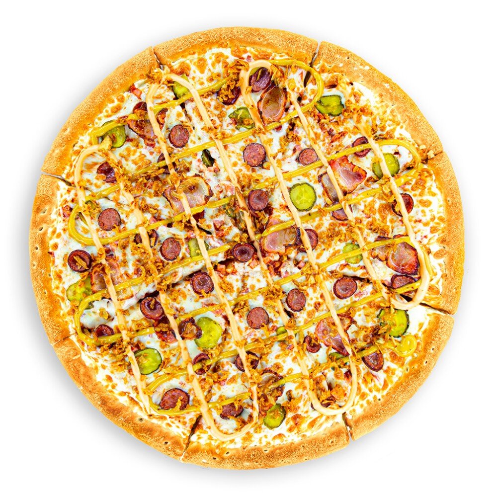Томатный пицца соус, ветчина, сыр моцарелла, колбаски охотничьи, огурчик маринованный, бекон, соус горчичный и кетчунез, хрустящий жареный лук