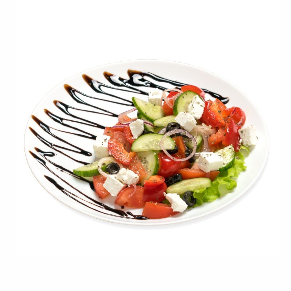 Свежие огурцы и помидоры, болгарский перец, лук красный, маслины, сыр фетакса, лист салата, оливкоое масло, базилик, соль, перец ч/м