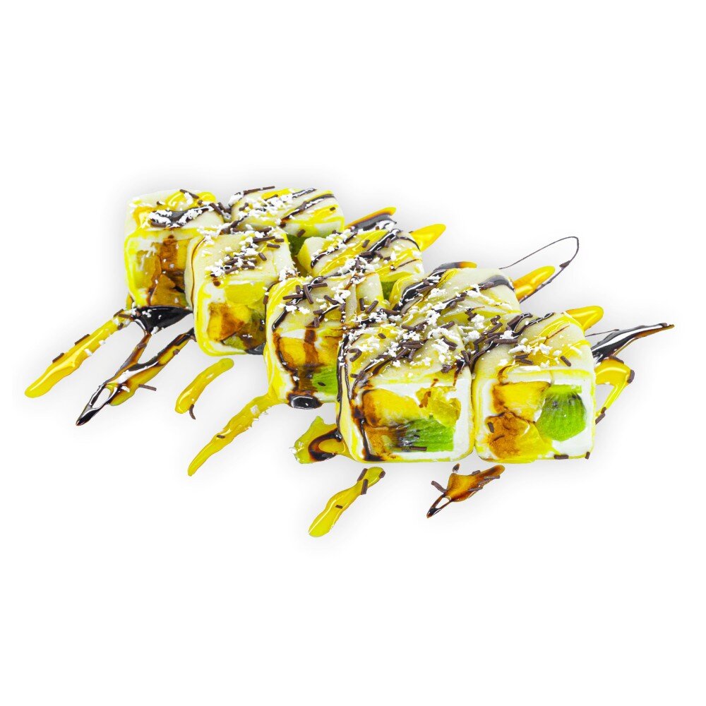 Спринг тесто, сыр сливочный, банан, киви, ананас, шоколадный и анильный топпинги, кокосовая стружка, шоколадная крошка