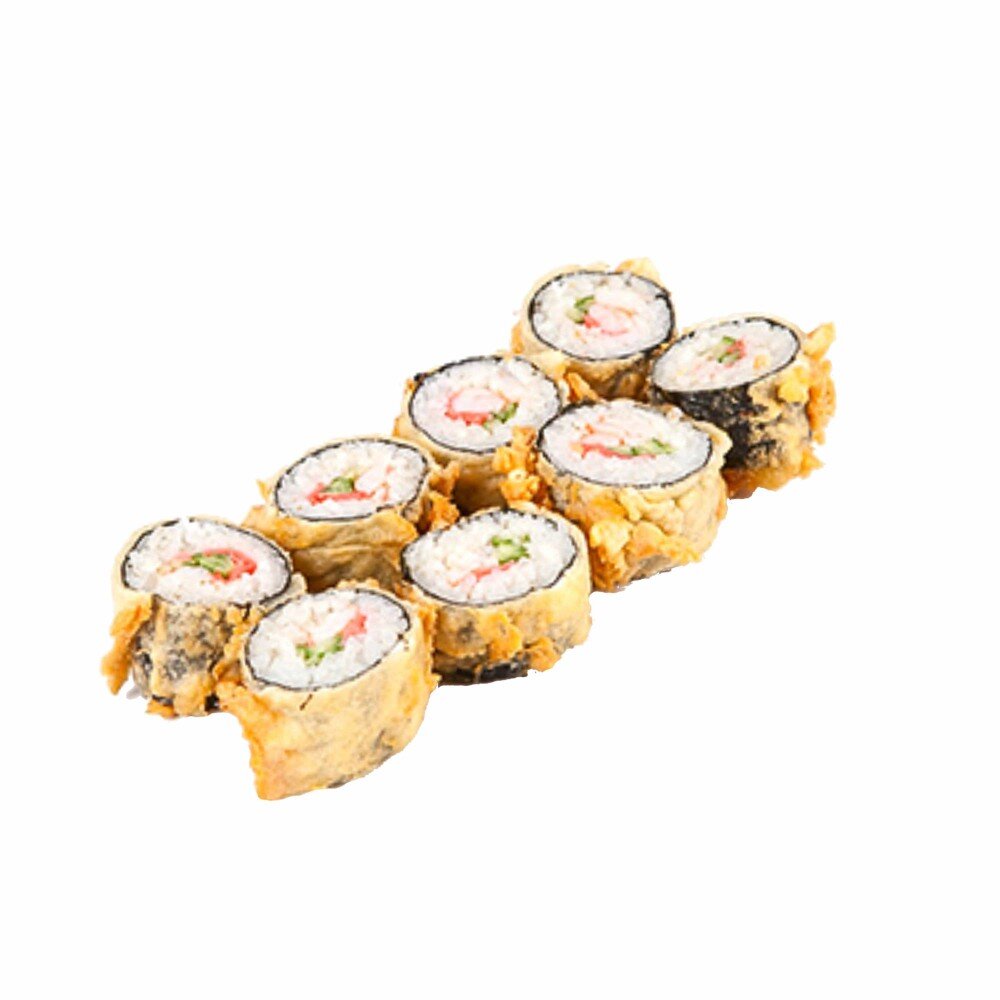 Рис, нори, сыр сливочный, лосось, мясо краба (имитация), масаго оранжевая, темпура (соевый соус, имбирь и васаби в комплекте)