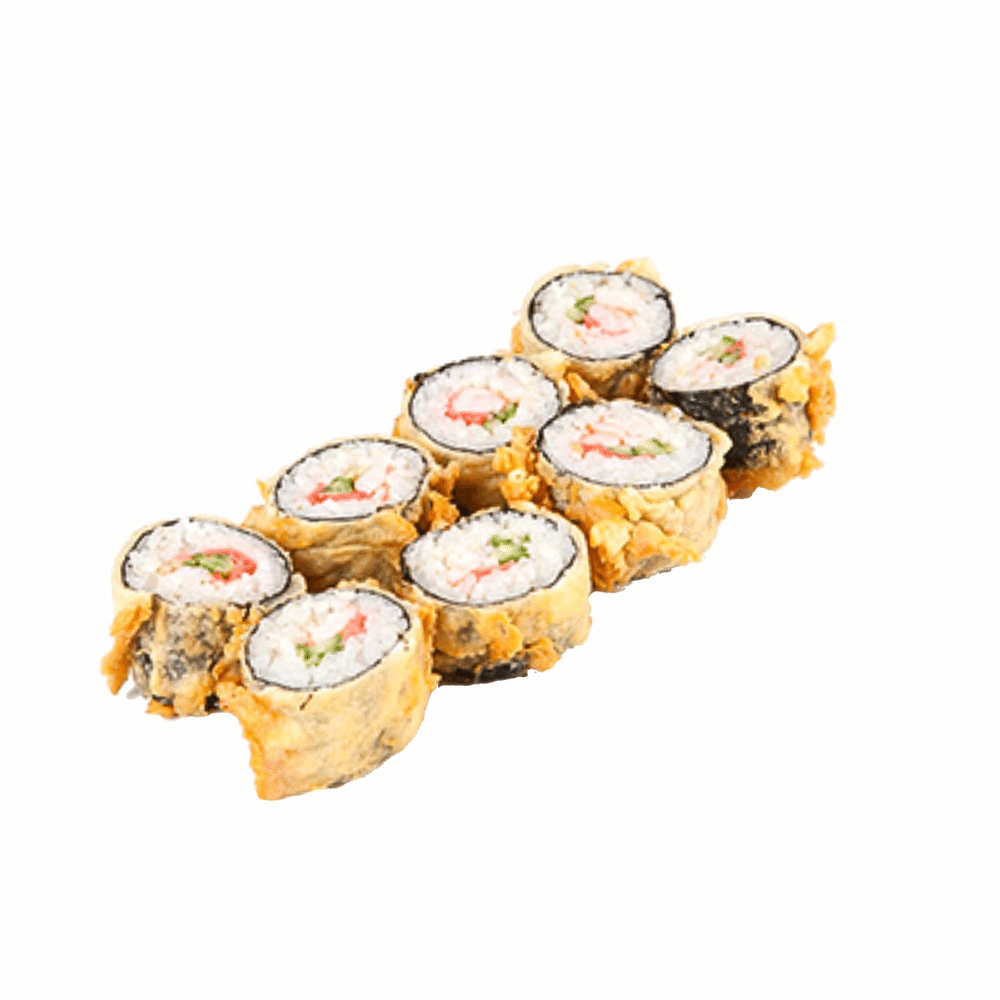Рис, нори, сыр сливочный, лосось, мясо краба (имитация), масаго оранжевая, темпура (соевый соус, имбирь и васаби в комплекте) *Внешний вид блюда может отличаться от картинки