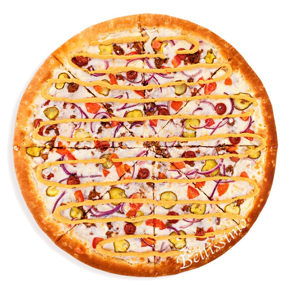 Томатный соус, говяжий фарш, сыр моцарелла, колбаски охотничьи, огурчик маринованный, свежие томаты, лук красный, соус бургер