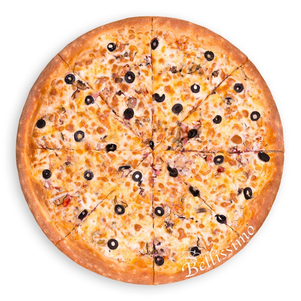 Томатный соус, сыр моцарелла, ветчина, грудинка, шампиньоны, огурчик маринованный, маслины