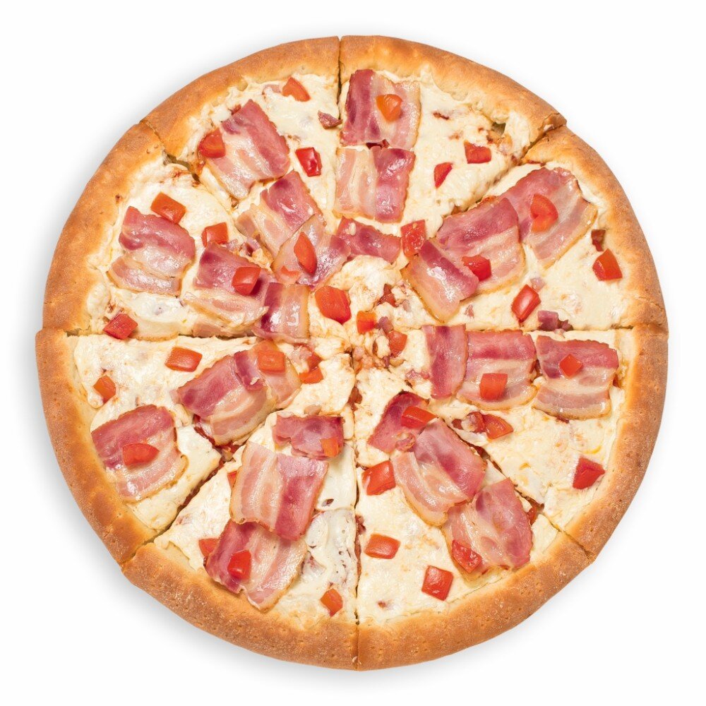 Томатный соус, сыр моцарелла, бекон, пикантная пепперони, свежие томаты