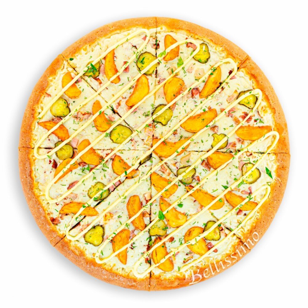 Томатный соус, сыр моцарелла, грудинка, огурчик маринованный, картофельные дольки, соус сырный, свежая зелень