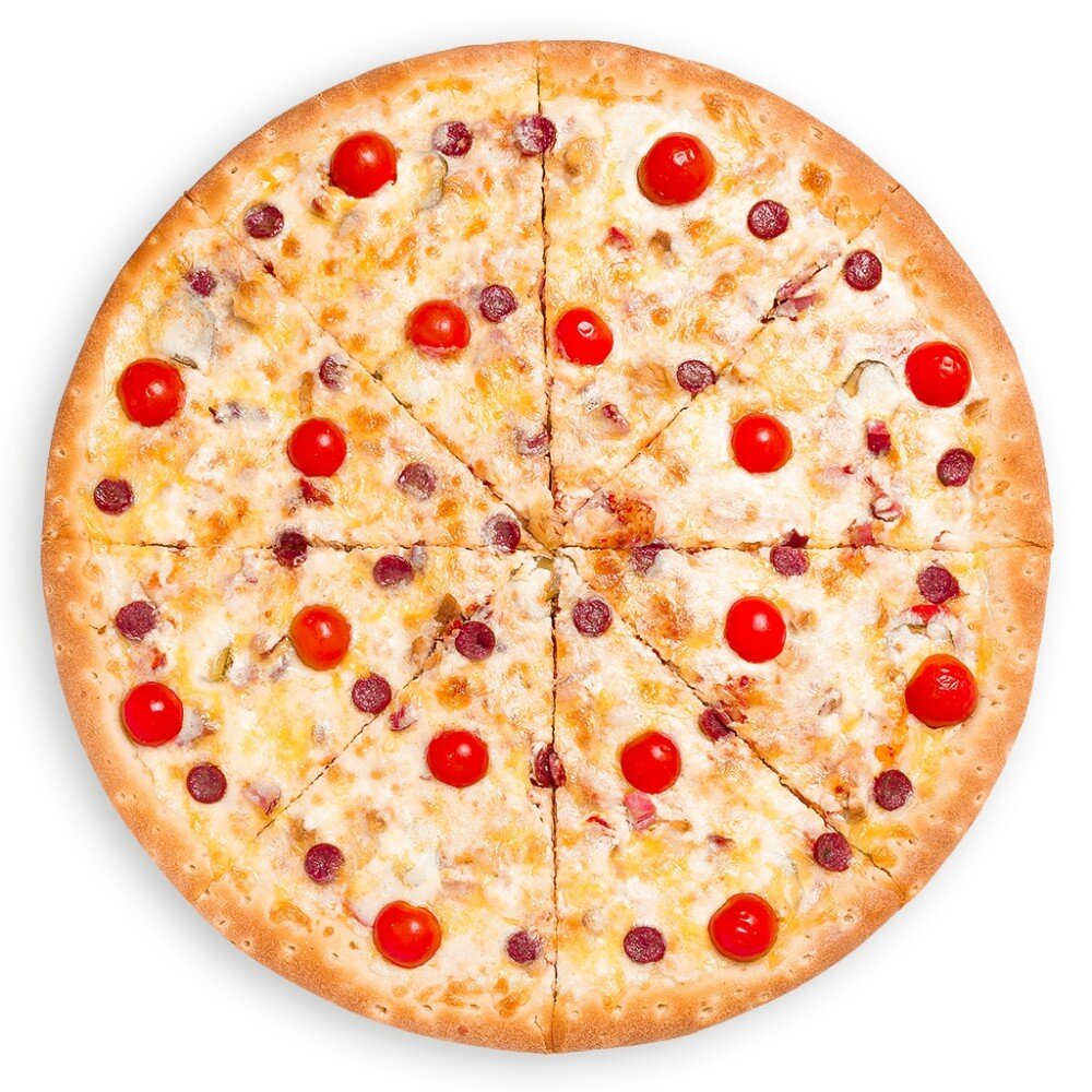 Томатный соус, сыр моцарелла, пикантная пепперони, охотничьи колбаски, копчёная курочка, маринованные огурцы, помидоры черри