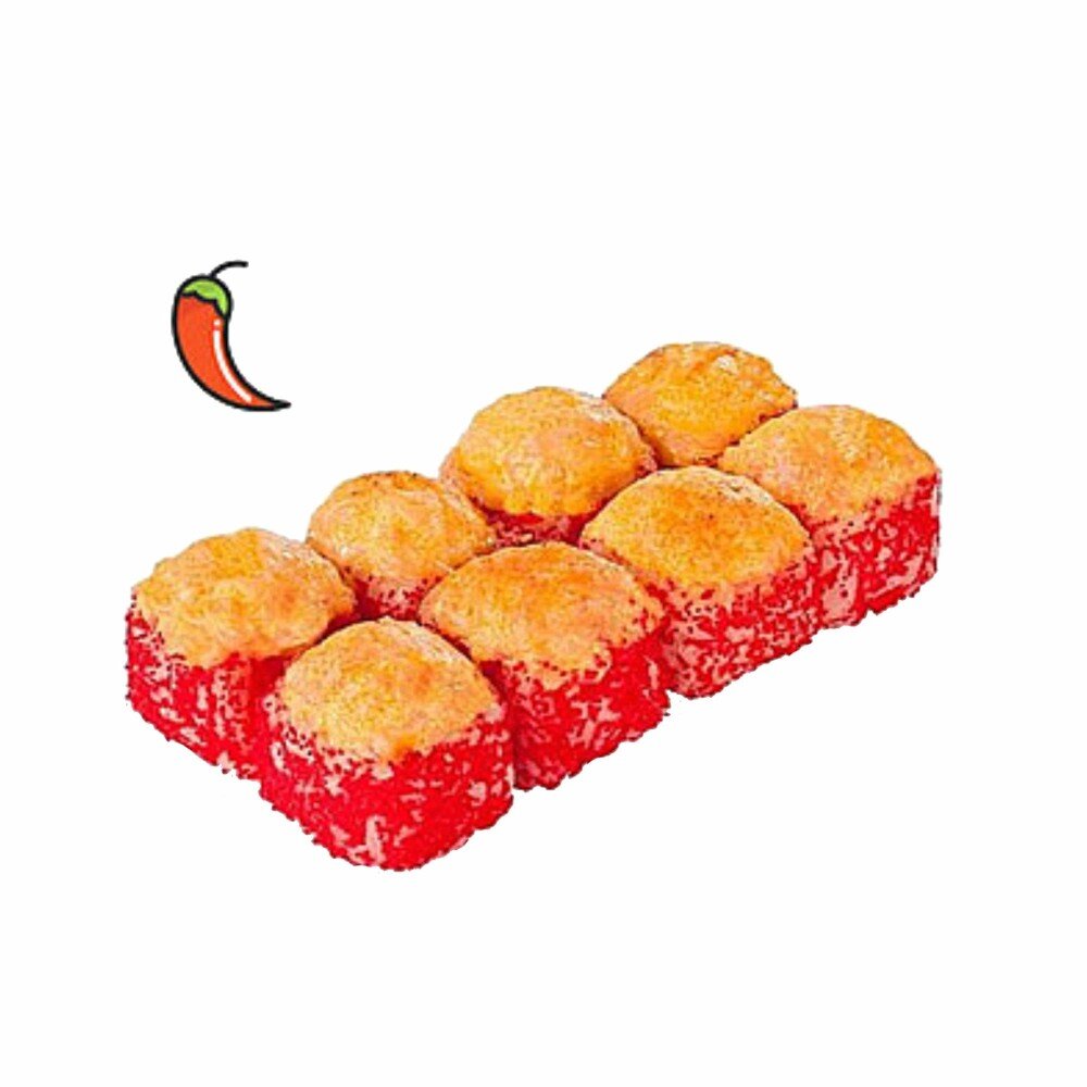 Рис, нори, бекон, курица копчёная, японский майонез, огурец, масаго красная, спайси соус, сыр гауда (соевый соус, имбирь и васаби в комплекте)