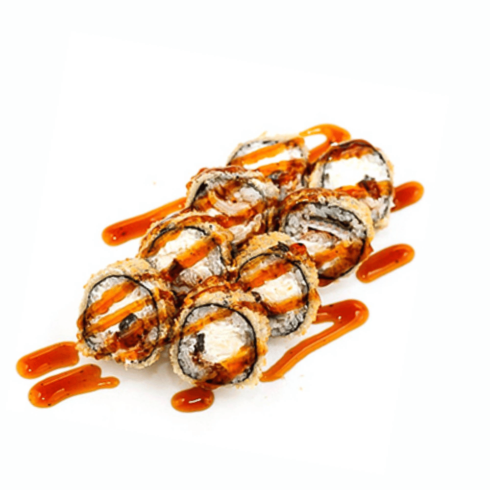 Рис, нори, огурец, сыр сливочный, угорь, темпура, соус унаги (соевый соус, имбирь и васаби в комплекте) *Внешний вид блюда может отличаться от картинки