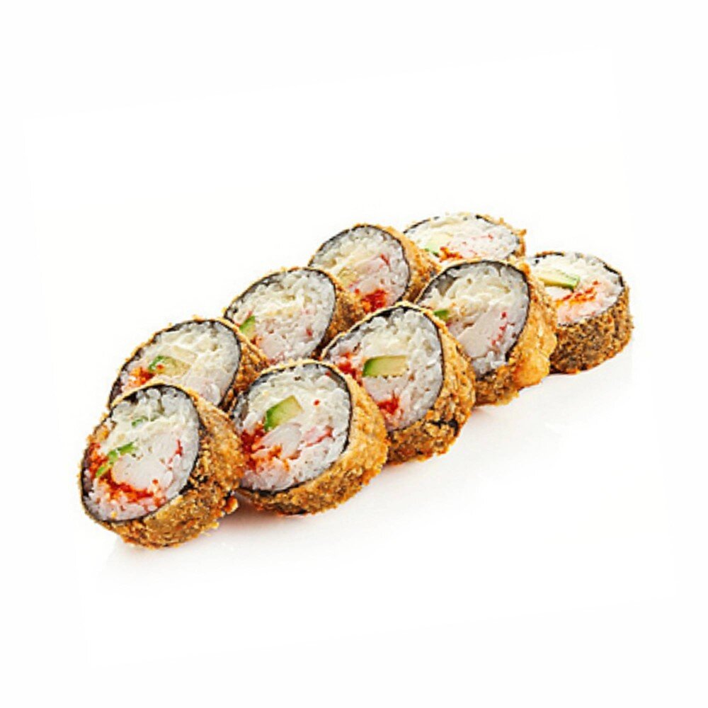 Рис, нори, мясо краба (имитация), спайси соус, перец болгарский, огурец, темпура (соевый соус, имбирь и васаби в комплекте)