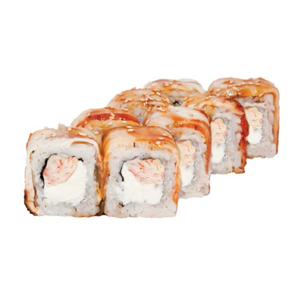 Угорь, мясо краба (имитация), рис, нори, сыр сливочный, соус унаги, кунжут (соевый соус, имбирь и васаби в комплекте)