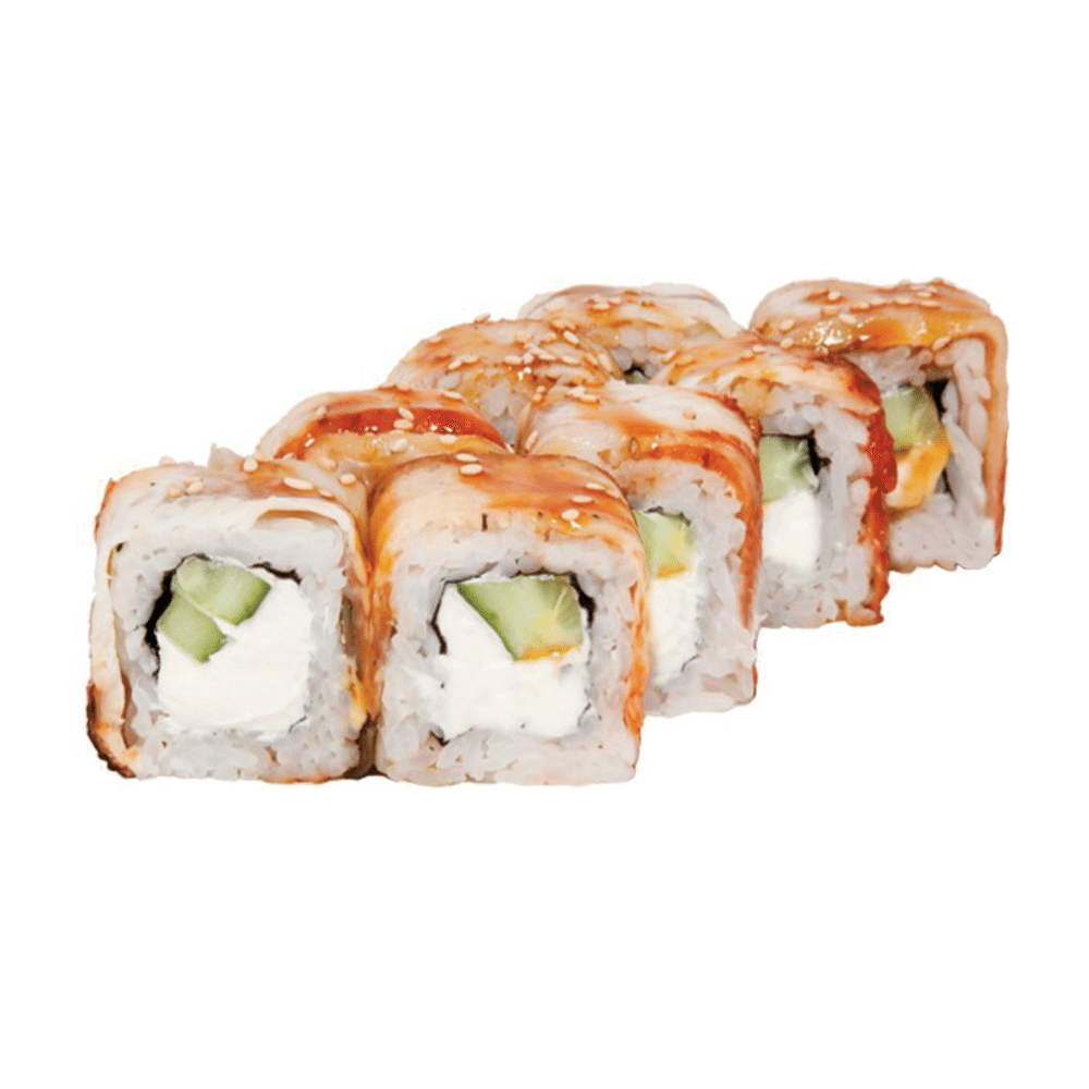 Угорь, рис, нори, сыр сливочный, огурец, соус унаги, кунжут (соевый соус, имбирь и васаби в комплекте) *Внешний вид блюда может отличаться от картинки