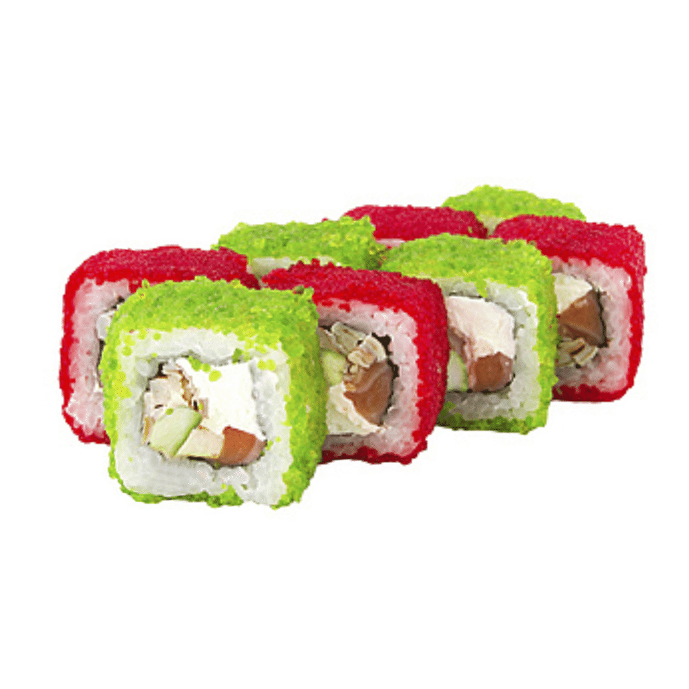 Масляная рыба, рис, нори, сыр сливочный, огурец, масаго красная, масаго зеленая (соевый соус, имбирь и васаби в комплекте) *Внешний вид блюда может отличаться от картинки