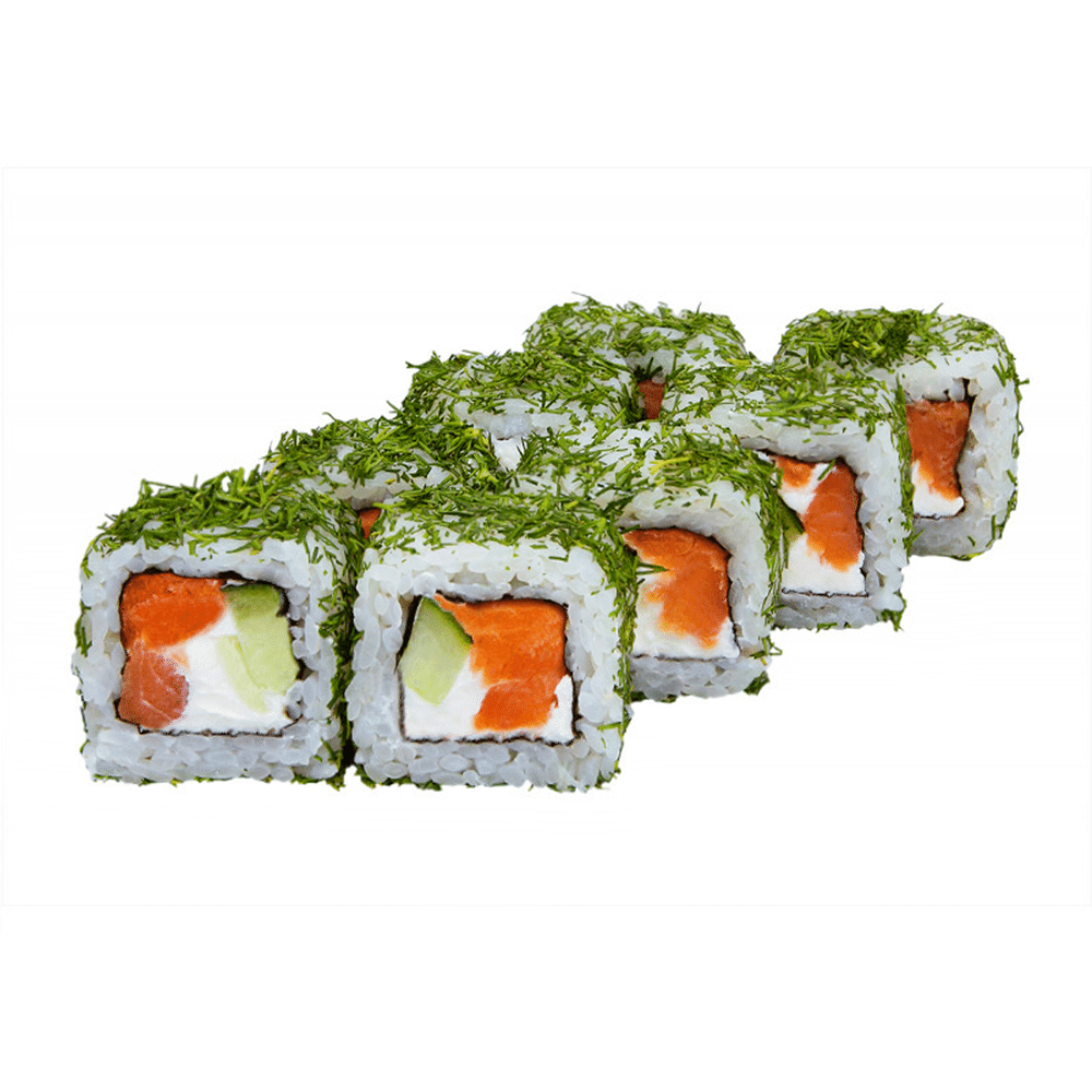 Лосось, рис, нори, сыр сливочный, огурец, укроп (соевый соус, имбирь и васаби в комплекте) *Внешний вид блюда может отличаться от картинки