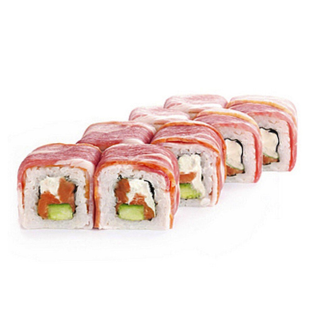 Лосось, бекон, рис, нори, огурец, сыр сливочный (соевый соус, имбирь и васаби в комплекте)