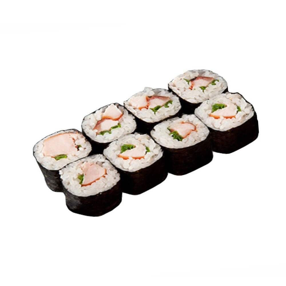 Лосось, курица копчёная, рис, нори, спайси соус, лист салата (соевый соус, имбирь и васаби в комплекте)