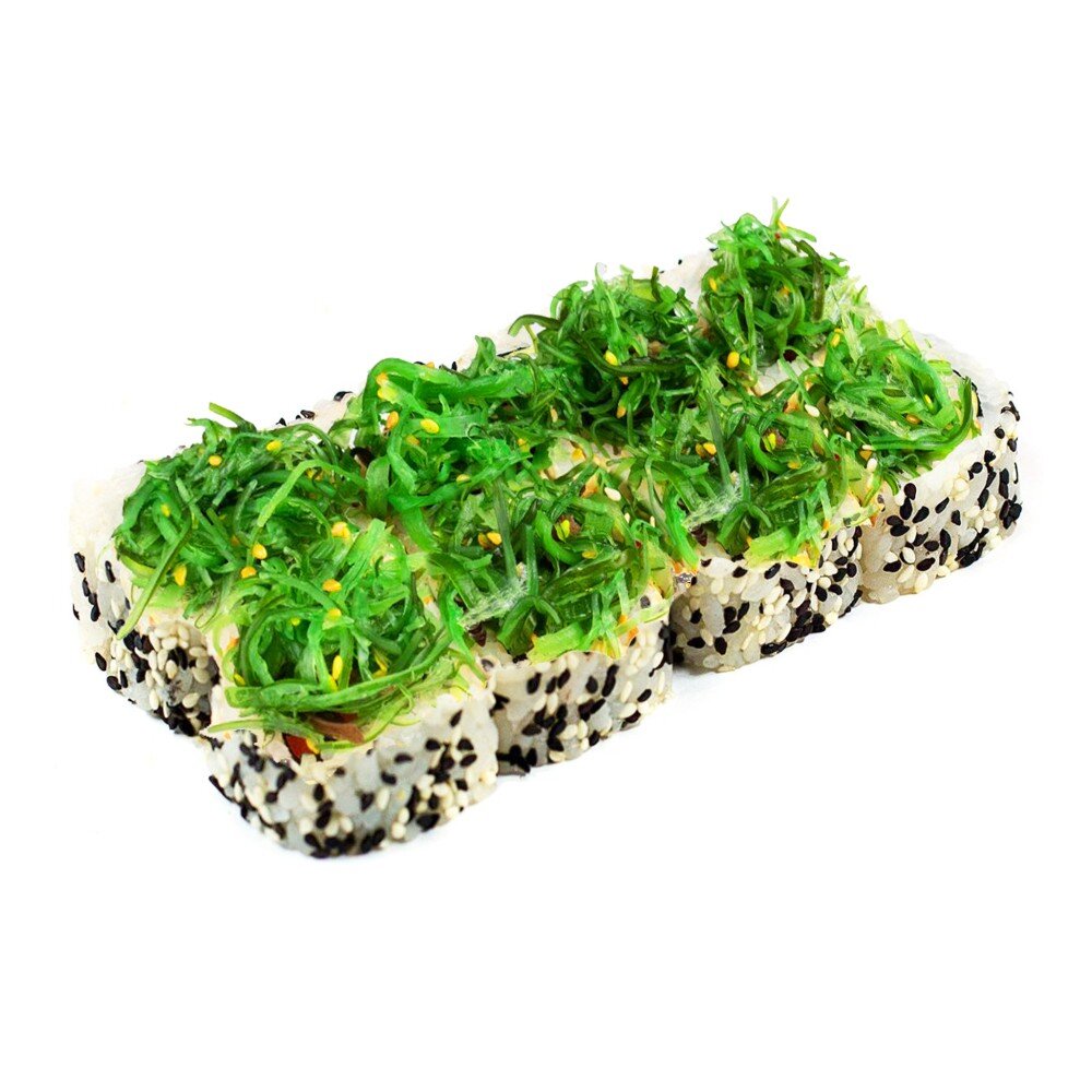 Лосось, рис, нори, салат чукка, перец болгарский, сыр сливочный, кунжут (соевый соус, имбирь и васаби в комплекте)