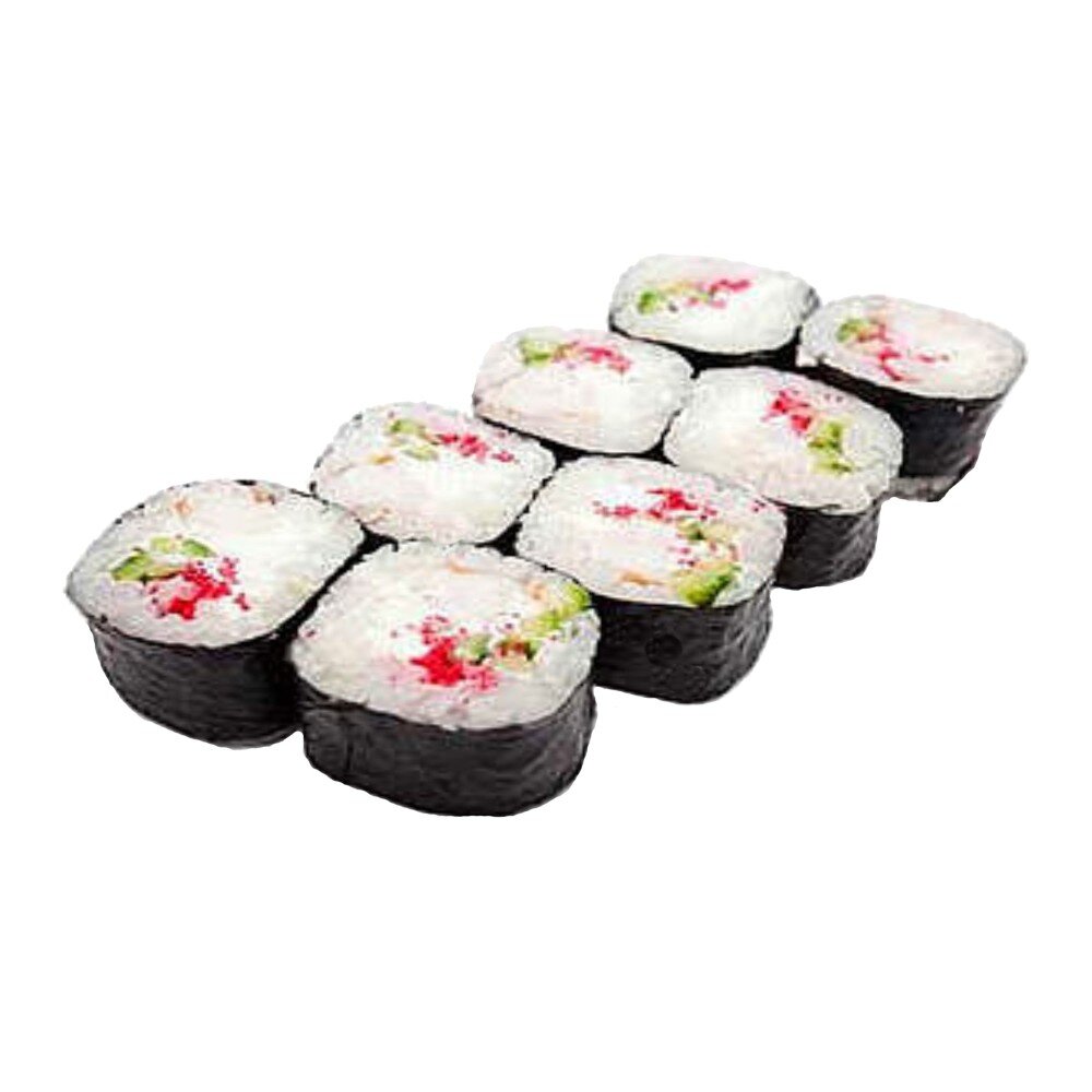 Рис, нори, сыр сливочный, мясо краба (имитация), масаго красная, огурец (соевый соус, имбирь и васаби в комплекте)
