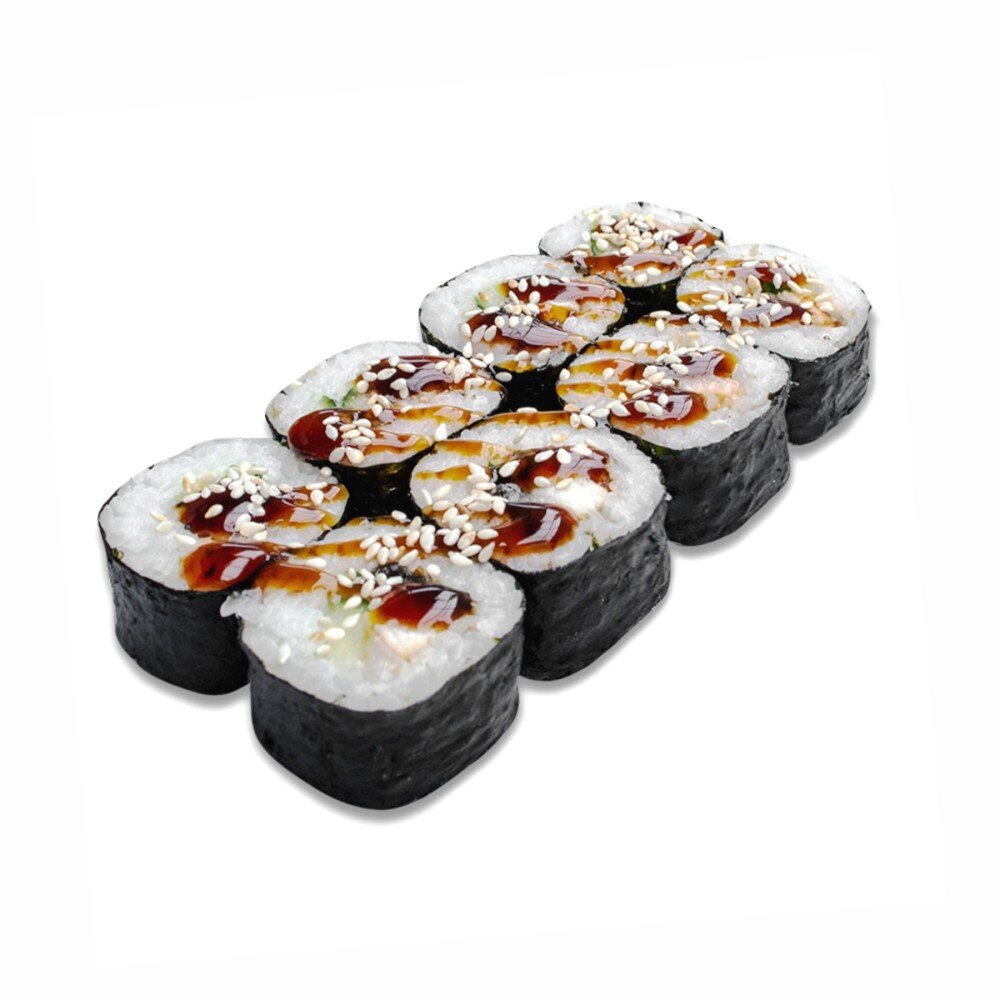 Угорь, рис, нори, кунжут, унаги соус (соевый соус, имбирь и васаби в комплекте)