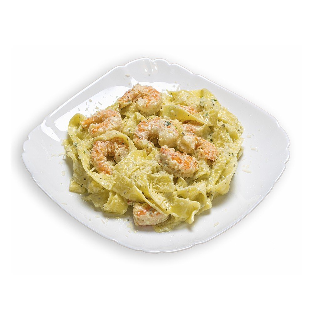 Паста Фетучини Тоскана, тигровые креветки, сливки, соус песто, сыр пармезан