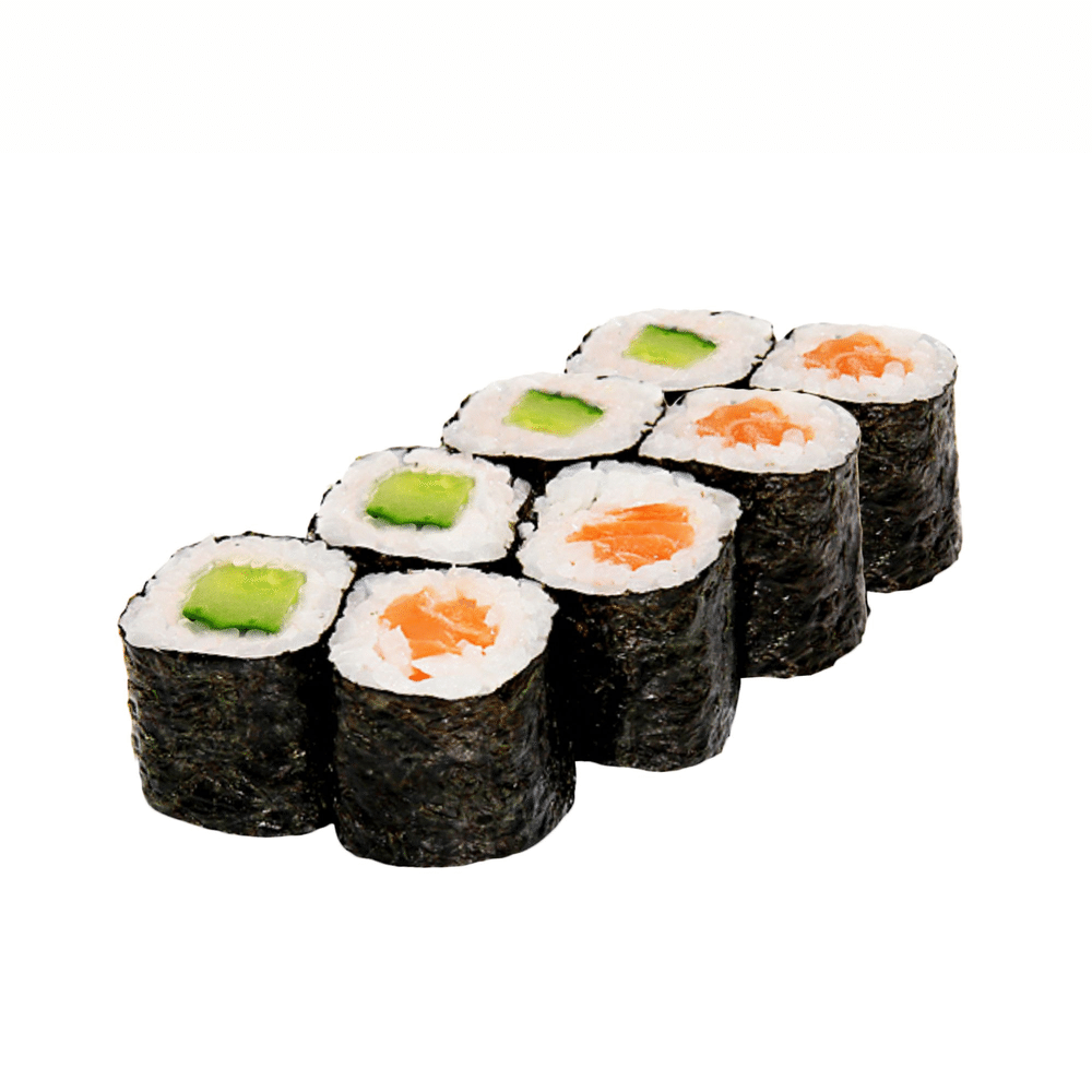 4 шт + 4 шт / 135 г Лосось, рис, нори / Огурец, рис, нори, кунжут (соевый соус, имбирь и васаби в комплекте) *Внешний вид блюда может отличаться от картинки