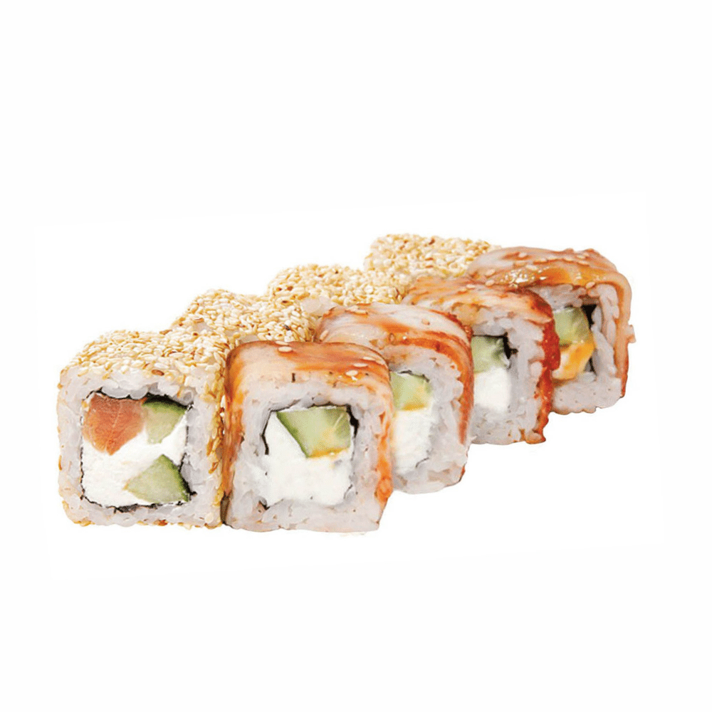 Угорь, рис, нори, сыр сливочный, огурец, соус унаги, кунжут / Лосось, рис, нори, огурец, сыр сливочный, кунжут