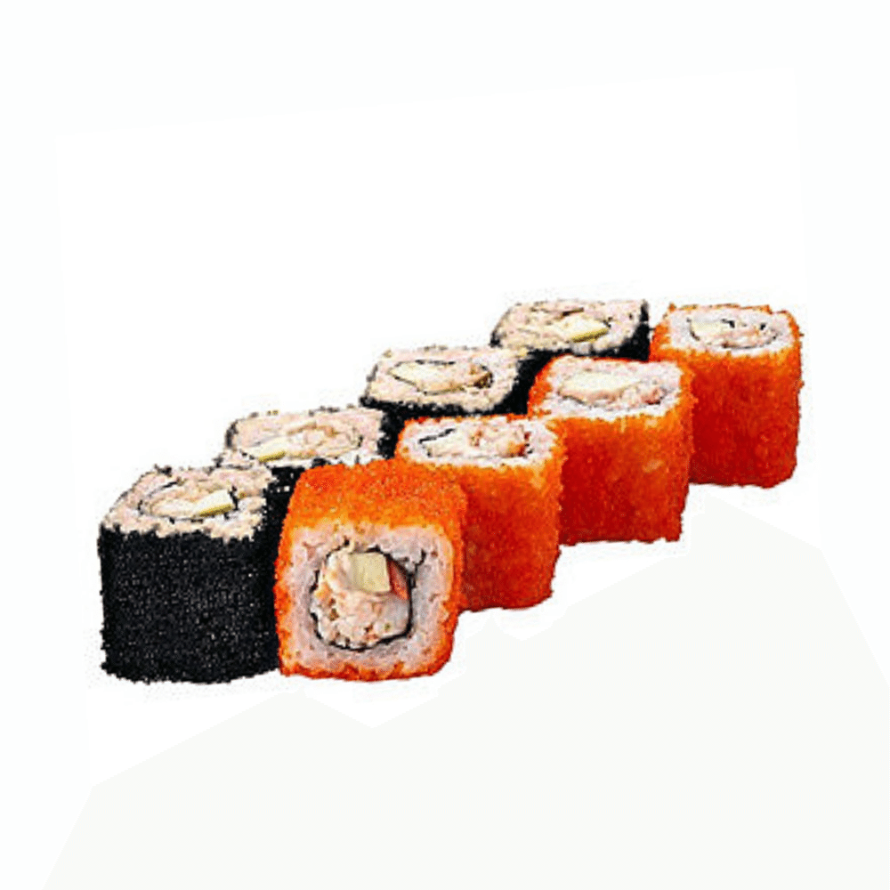 Мясо краба (имитация), рис, нори, японский майонез, огурец, масаго оранжевая / Масляная рыба, лосось, рис, нори, японский майонез, огурец, масаго черная