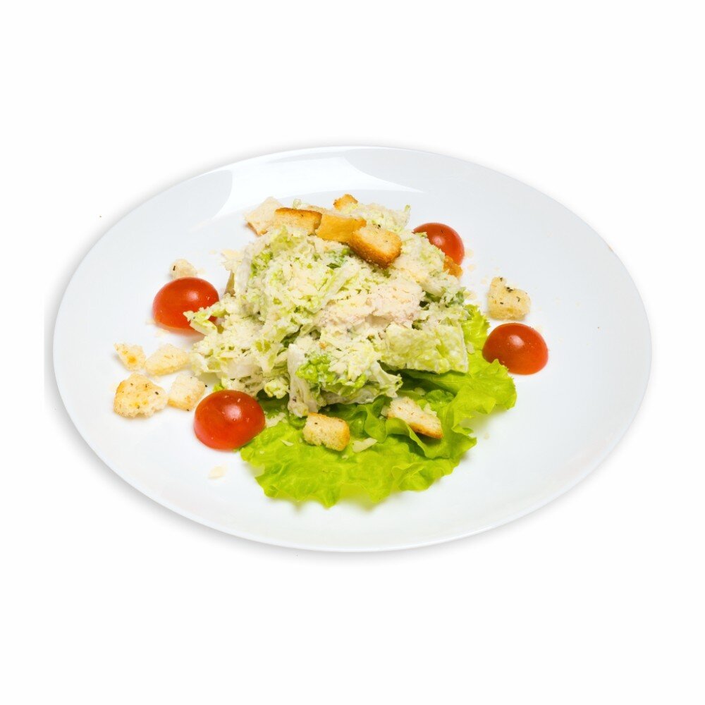 Грудка куриная копчёная, салат айсберг, сыр пармезан, соус цезарь, сухарики, помидорки черри, лист салата